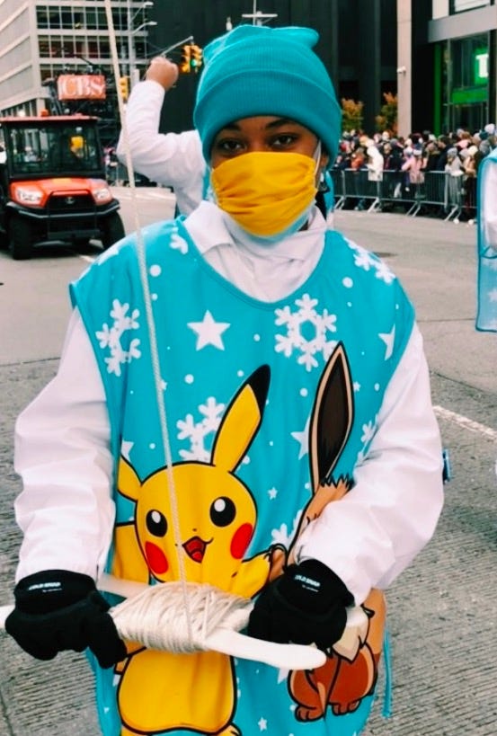 So how did I do it? At the time, I was an intern for NBCUniversal, which broadcasts the parade. About two or three months before the parade, I got an email offering interns volunteer spots in the 2021 parade. I immediately applied and was accepted! I got to be a balloon handler for the Pikachu and Eevee balloon, which debuted that year.